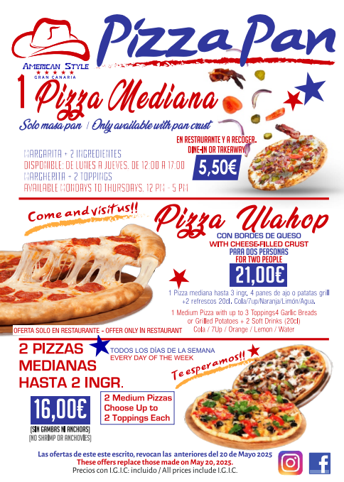 Te preparamos la pizza que tu quieras comando como base la pizza margarita y añadiendo los ingredientes que prefieras: Salsa de tomate, salsa barbacoa, ternera, bacón, jamón, pollo a la parrilla, salchicha, pepperoni, atún, gambas, pimiento verde, tomate fresco, champiñones, jalapeños, aceitunas, piña, cebolla, guindillas, extra de queso mozzarella